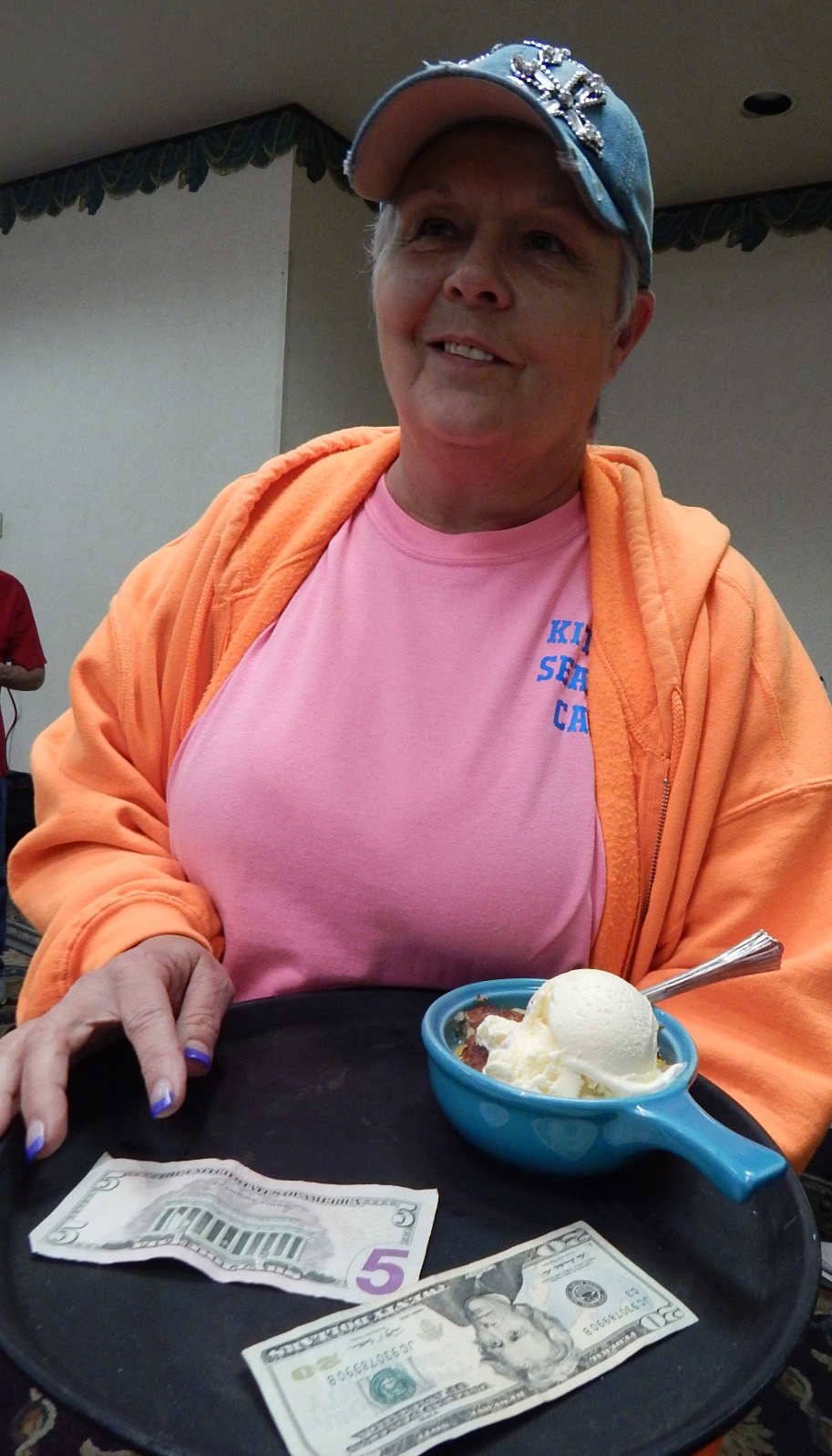 And last but not least, I could not fail to show a memory-lane picture of Kitty, owner of Kitty's Seaside Café, the inhouse restaurant at our retreat center. This woman has one of those deep, booming, southern voices that commands a room. If we wanted something special for breakfast, she'd rustle it up; I had her cook up shrimp and grits one morning -- if you've never had them, you are in for a treat! The night we first arrived, Kitty came in and announced that after dinner, she'd have a huge pan full of peach cobbler with Blue Bell vanilla ice cream for all of us - only five bucks each. Love ya, Kitty!