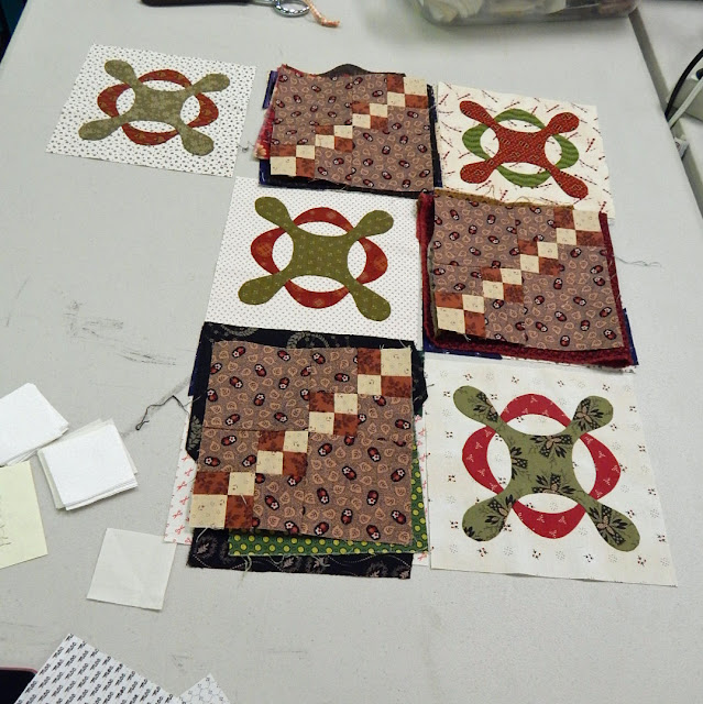 And when I walked by Gail again a bit later in the day... lo and behold, she had added another set of little blocks around the center of the quilt. See how easy it is to just start with a few blocks... and add a border that sets off what you've already sewn? That's how medallion quilts start! Note that a beautiful thing about civil war reproduction quilts is that you do not have to work hard to make the quilt sparkle; the prints and colors do a magnificent job of "playing" together and making a beautiful quilt. I hope I get to see Gail's quilt later, as it progresses.