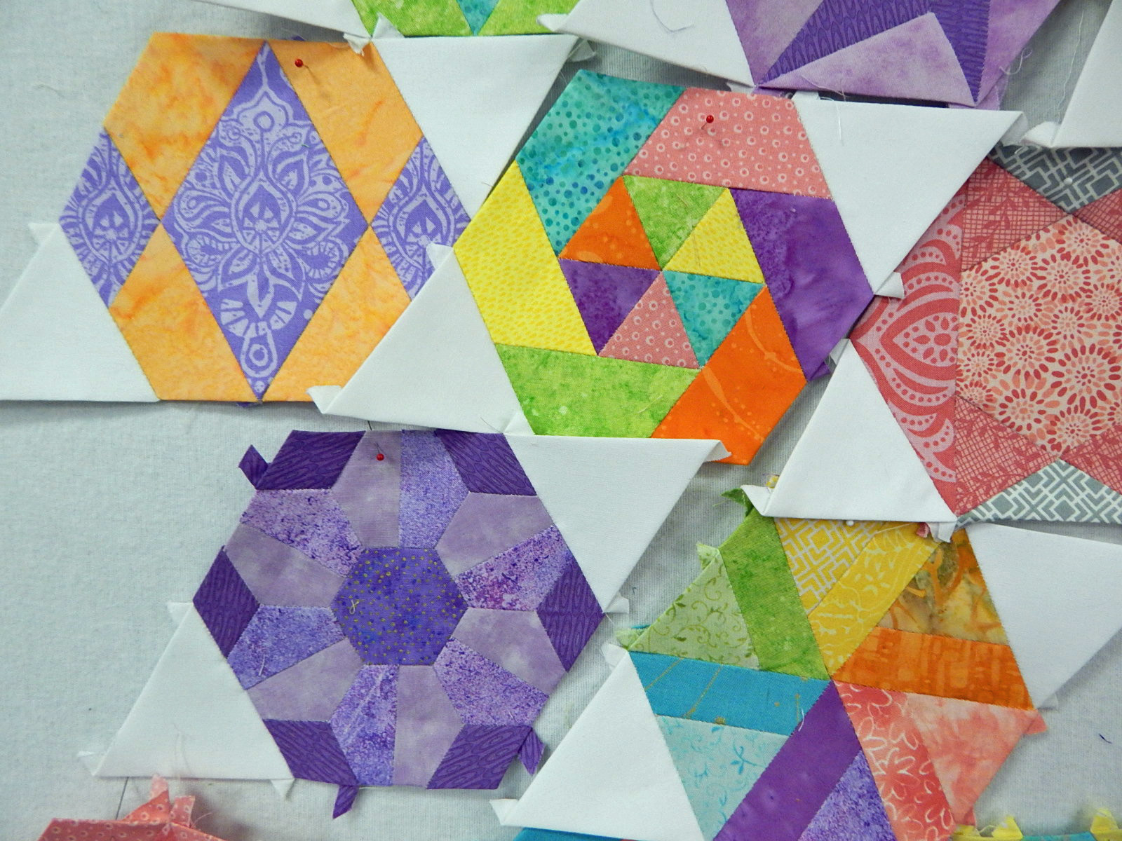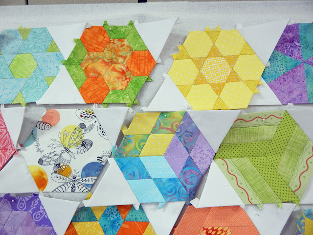 When Tonda had them all up on the design wall, it was a delightful array of beautiful pieced hexagons. Whee!