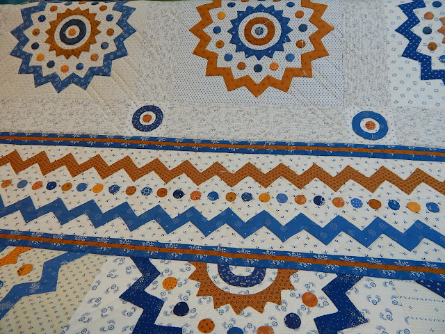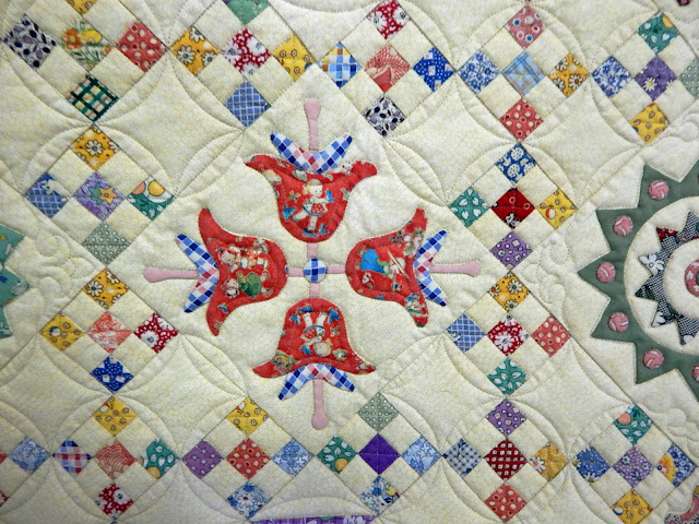 I hope you noticed the unique quilting done on those blocks by Lee Ann Lively. She is a wonderful longarm quilter. Below is the border - notice the quilting in it, too.