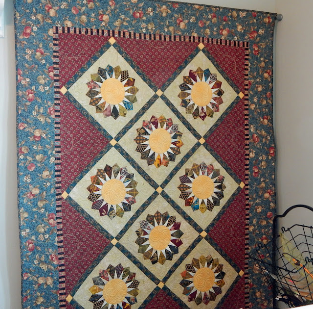 This quilt was another stunner on Cathy's wall. Those blocks are not easy to make, but look at how beautiful they look! I like Cathy's choice of a striped fabric for the inner border.