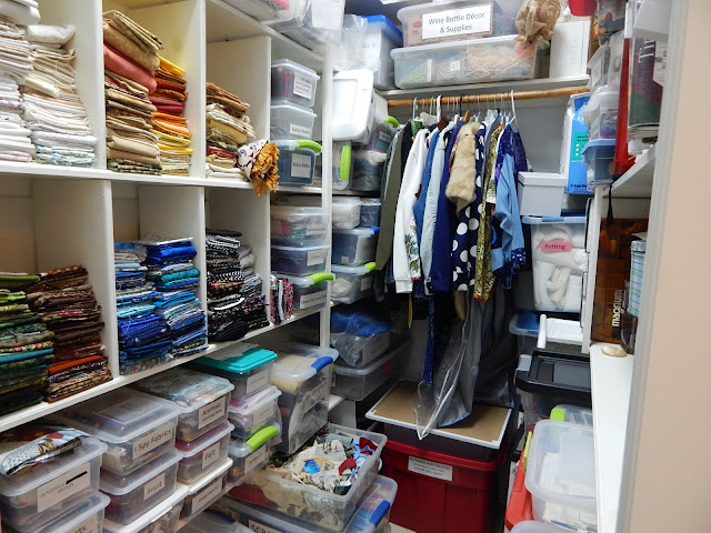 Sharon's studio is upstairs. She has a wall of shelving units - all glass-fronted. That is certainly nice, as it keeps the fabric neat and clean!