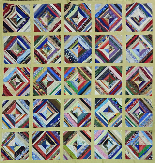 Another block that my guild offered as a lottery block during the past year was just a string-pieced block. One of the gals at the retreat took her winning blocks, sashed four together, and sashed the sets together to make this quilt top. It's a simple, colorful quilt made entirely from scraps.