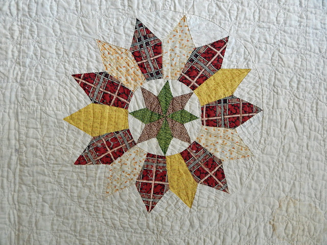 Some of the interior rings and circles have come unstitched, so I'm stitching them back down, bit by bit. I was amazed as I started working on this quilt. The original maker used only a 1/16th inch seam allowance. Say what??! You heard me! No wonder some of it had come unstitched. But it is easy to repair, and relaxing for me.