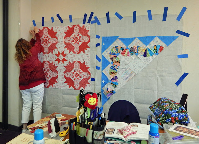 Sharon is in the borders class that I'm taking, too - you can see her progress on the red quilt, below. Sharon had some very large panels hung on rollers, so she can move these around on the wall, giving her a huge design wall area. Nice job!